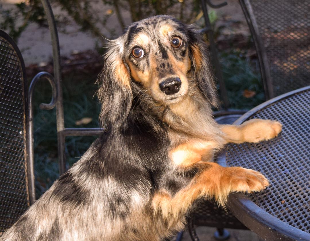 Cookie is a lovely black/cream dapple, also known as a "Silver Dapple". She is a gorgeous, funny, and spoiled, ong coat, miniature Dachshund.
