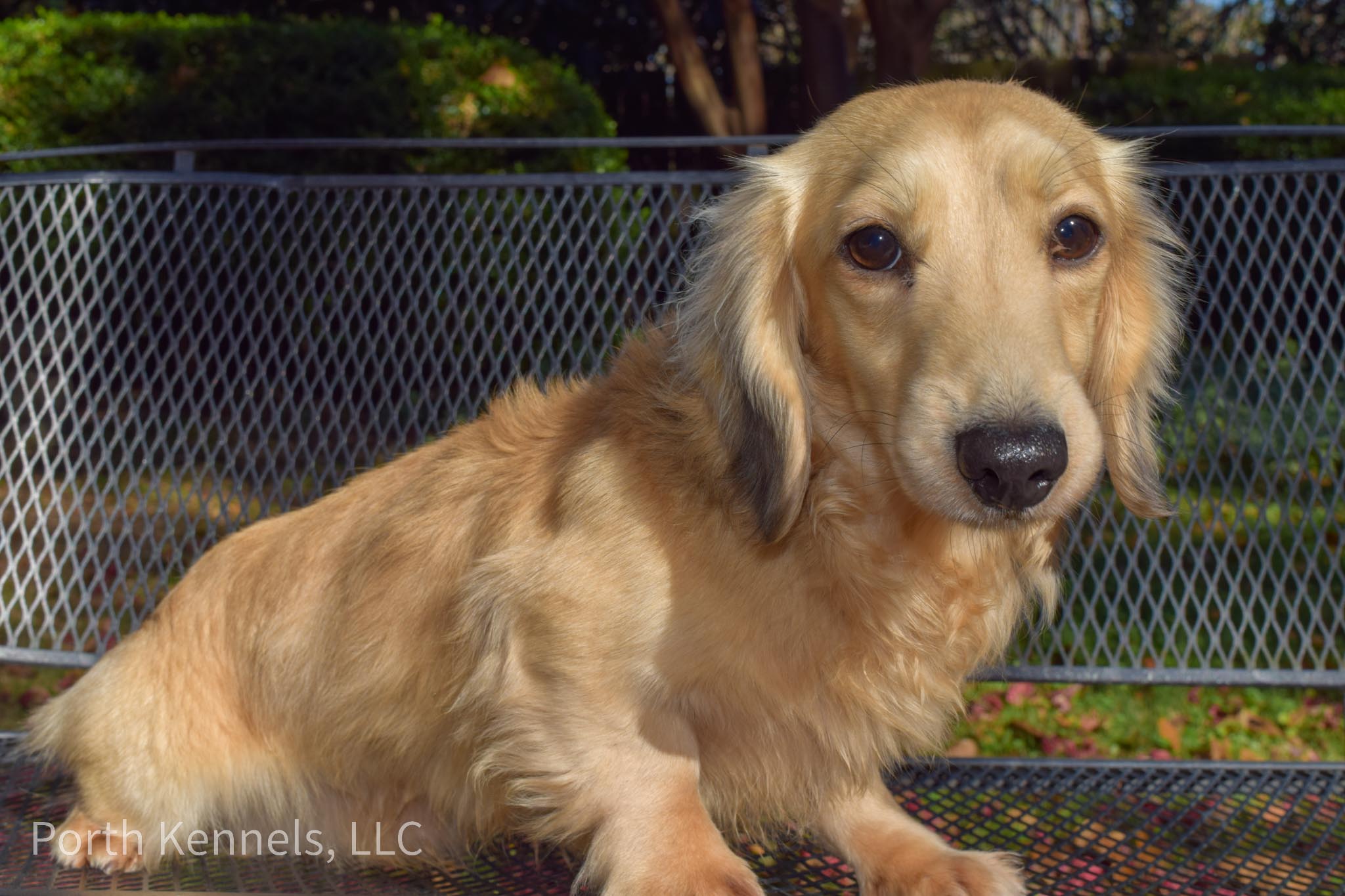 Fifi is a young, Shaded English cream, long coat, miniature Dachshund with a sweet disposition. She also had her first litter in 2025. She was a wonderful sweet mom and the pups were beautiful.