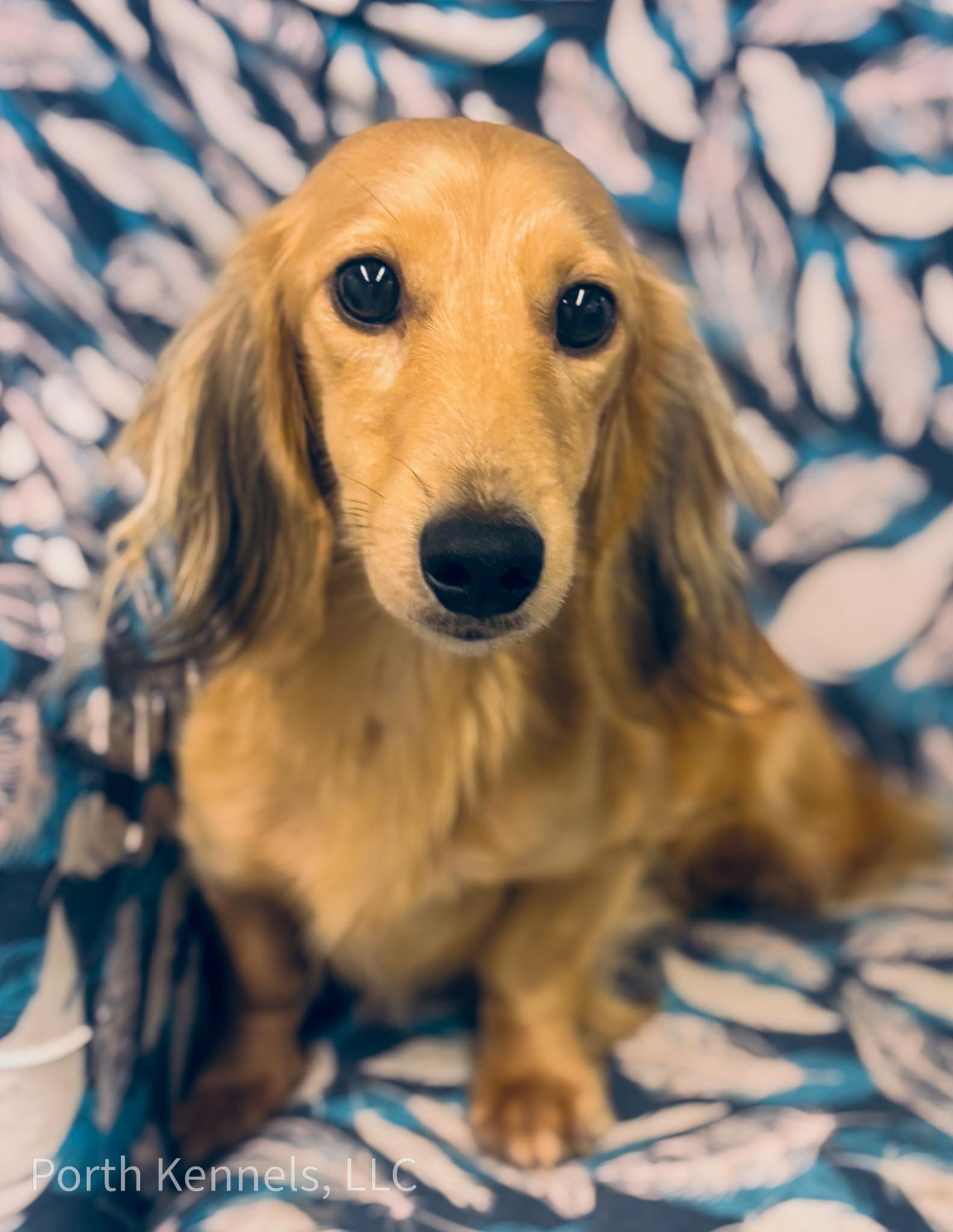 Viola is an English cream, long coat, miniature Dachshund known for her gentle temperament. She’s a dedicated mother, tending to her pups with love. Viola plays an important role in our breeding program.