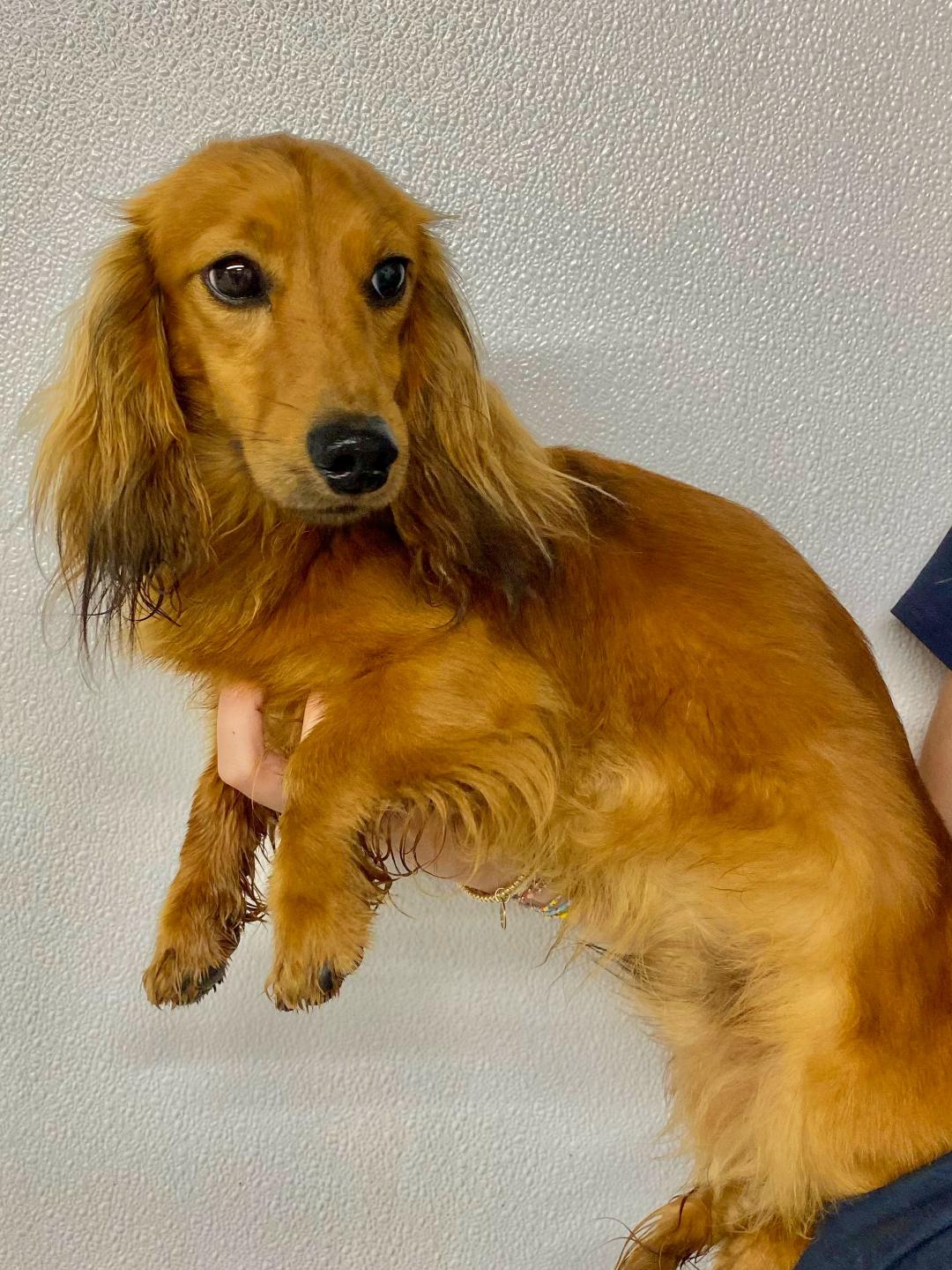 Porth's Flynn is a lovely, Red long coat, miniature Dachshund from our English Cream lines. He has sired his first litters in early 2023. Will be an important part of our future breeding program. Flynn weighs 10 lbs.