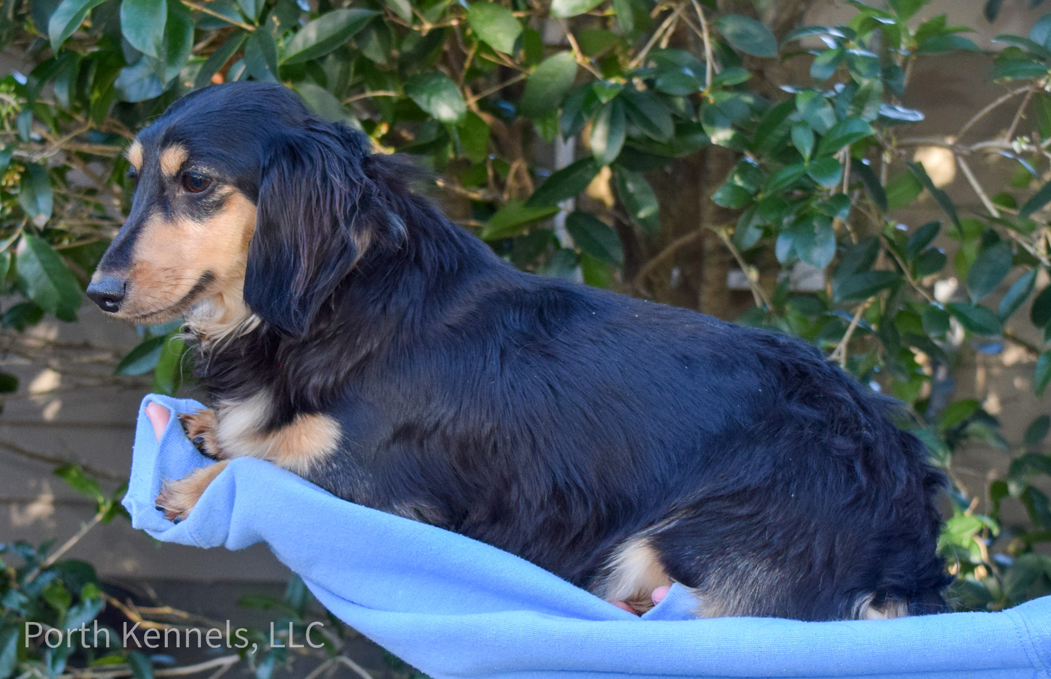 One of our favorite colors in the classic Black/Cream. April is a beautiful example of a black/cream, long coat, mini Dachshund. She is expecting her first litter in early 2025. She is a great addition to our breeding program.