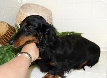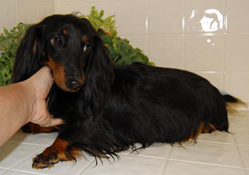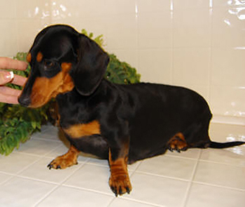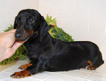 Porth's Marta is a small, lively black/tan smooth coat Dachshund. Loves attention. She is approximately 9 lbs. and has been a great little mom for us.