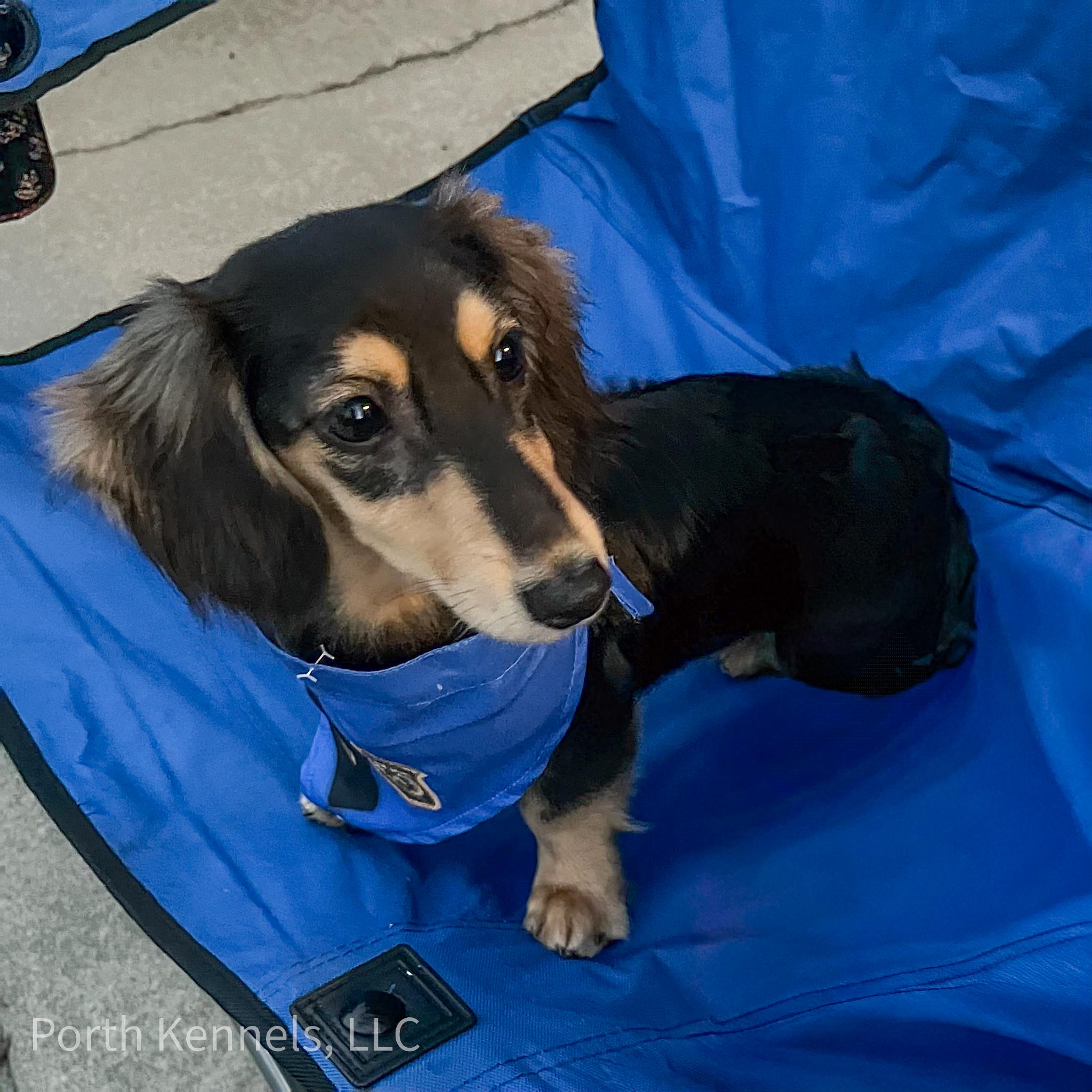 Maple is a classic Chocolate/Cream long coat,miniature Dachshund from our English Cream genetics. Beautiful and great personality.