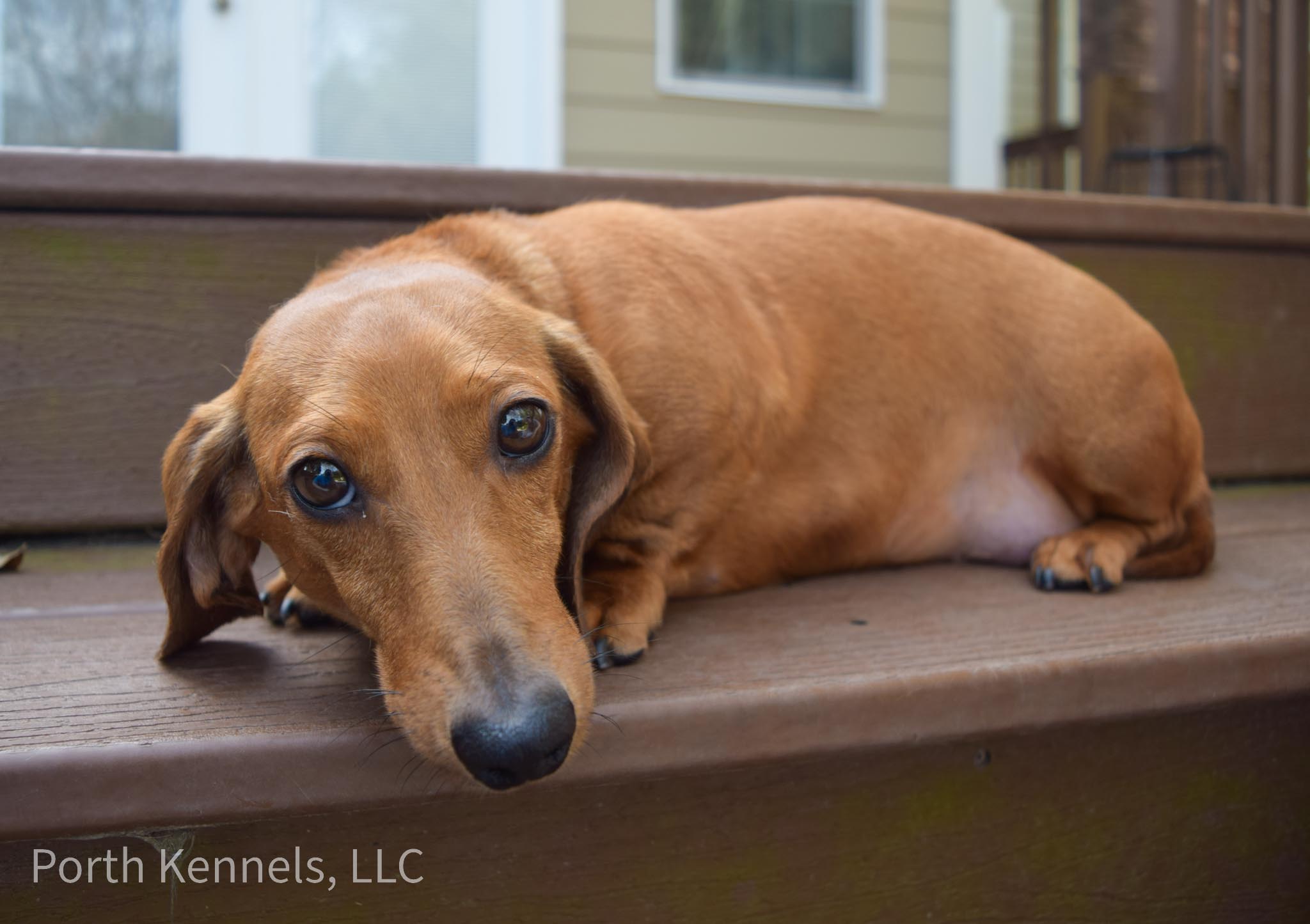 Vivian is a lovely, classic red smooth coat, miniature Dachshund. She had her first litter in the Spring of 2023. Sweet mother.