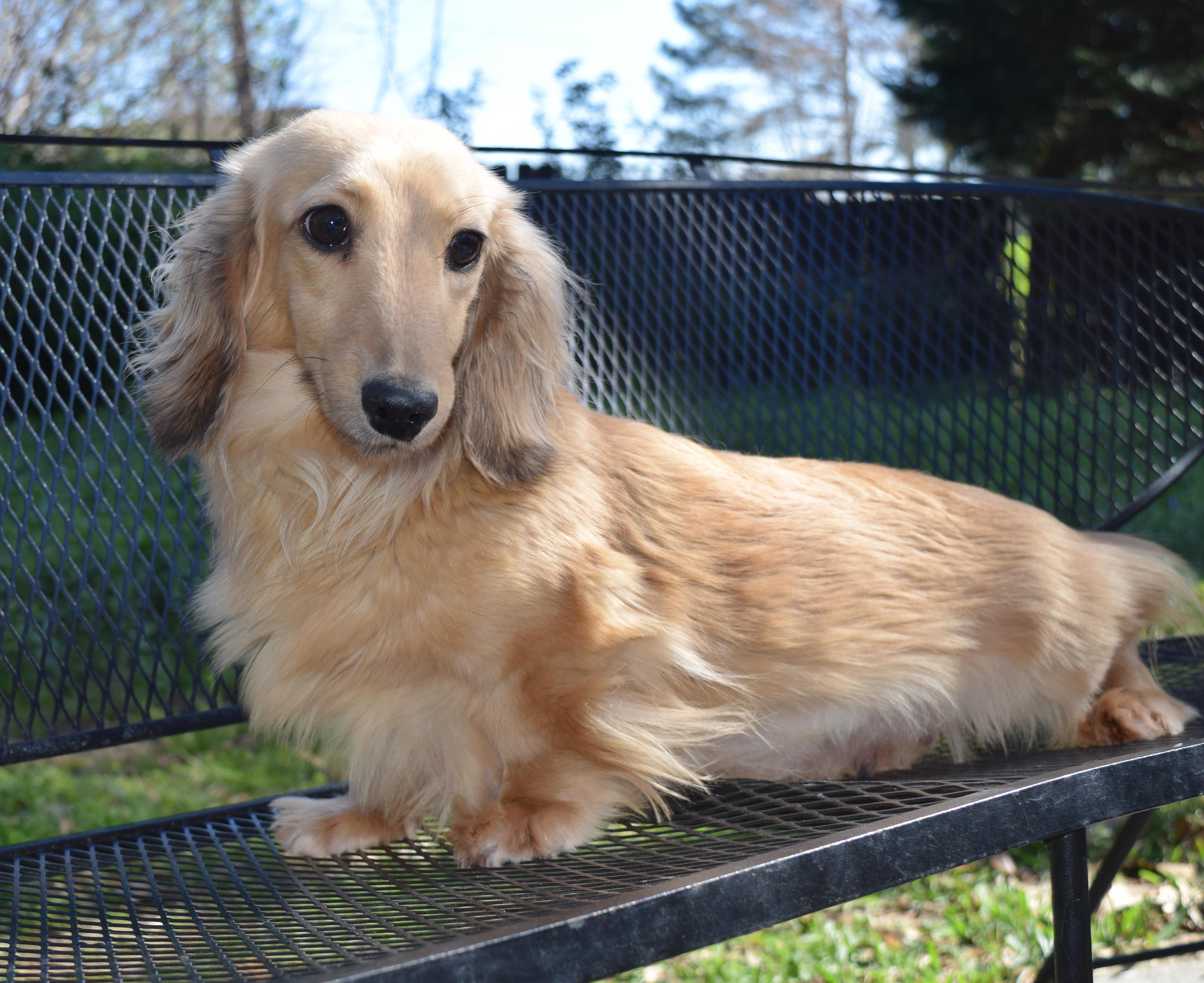 Porth's Sasha a is a lovely, English Cream, long coat, miniature Dachshund. She has a sweet temperament and beautiful coat. She is the littermate of Mila. Pretty and sweet.