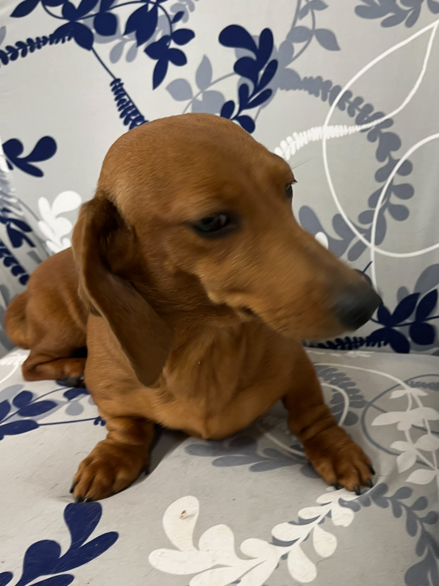 A beautiful red smooth coat, mini Dachshund, Vivian, is one of our sweetest moms. She is a classic red smooth.