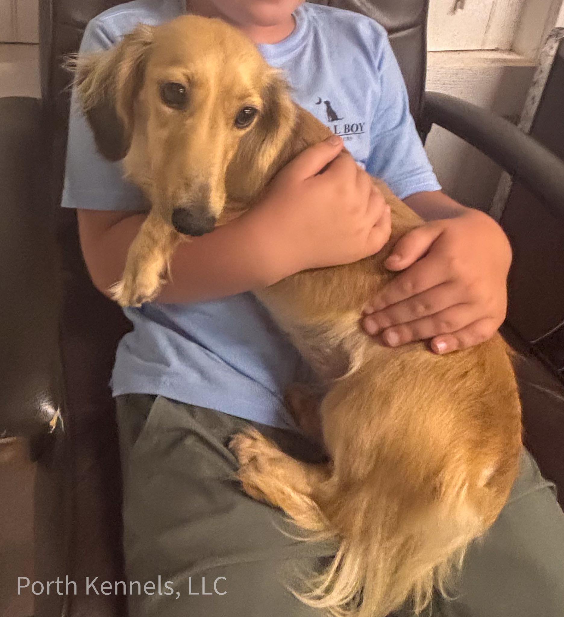 Our English Cream female, Wrenn, is a very sweet mom with a wonderful temperament. She is a Porth-bred pup, and will have her first litter in late 2025.